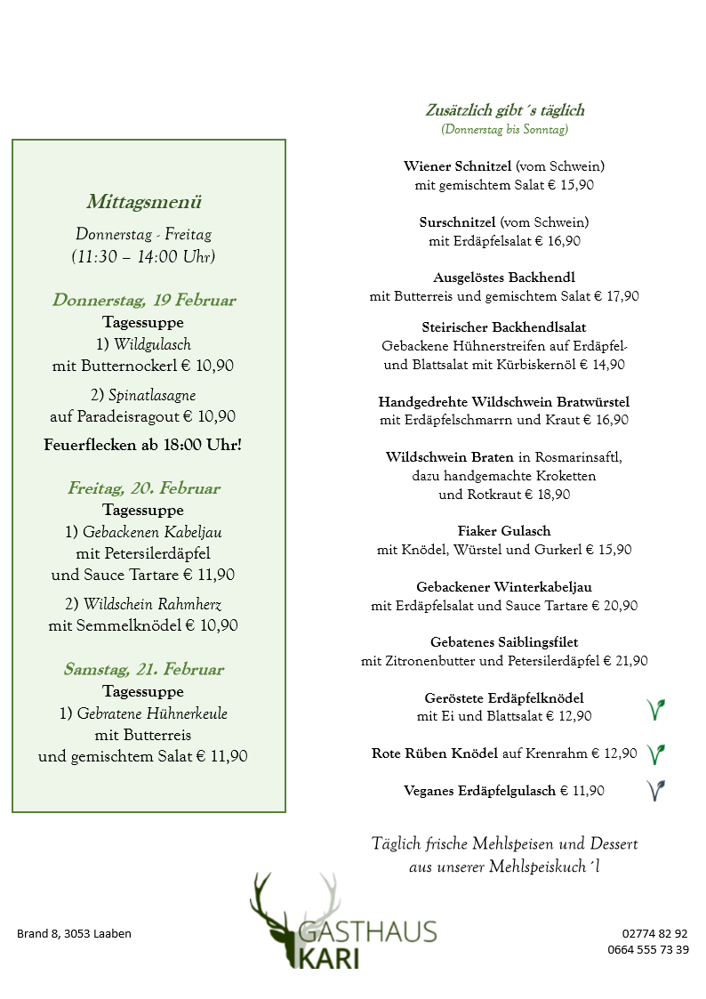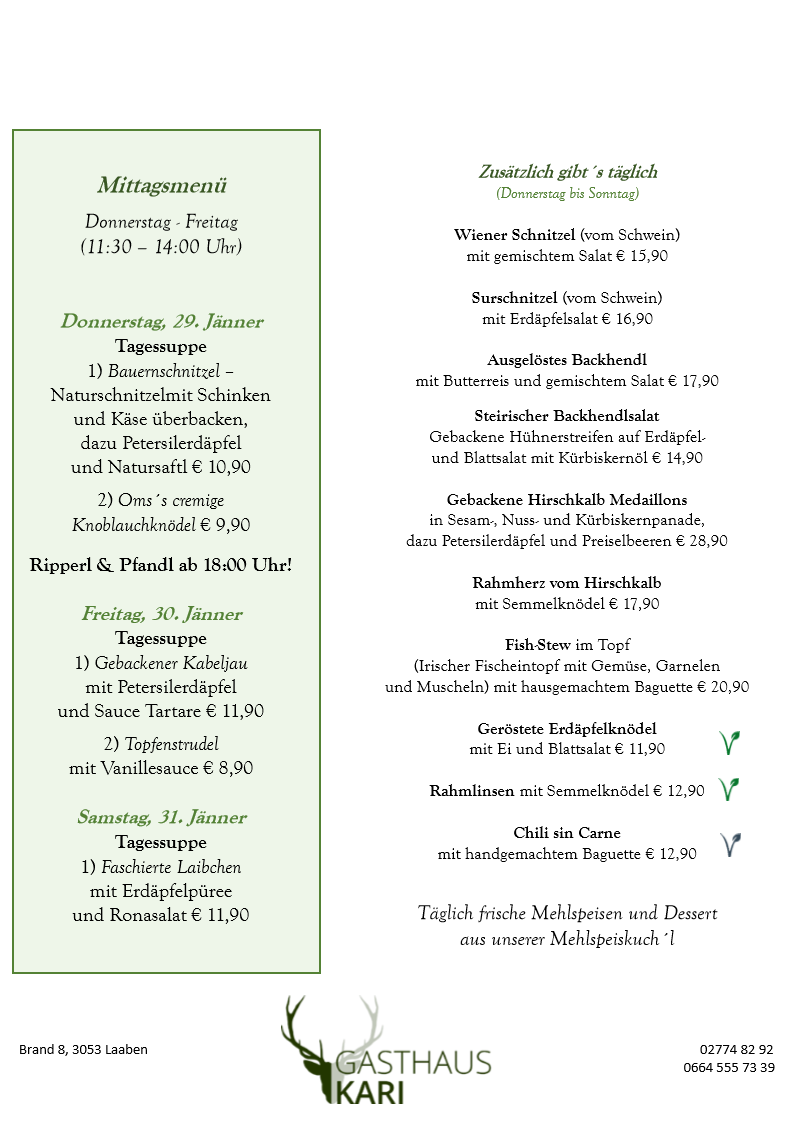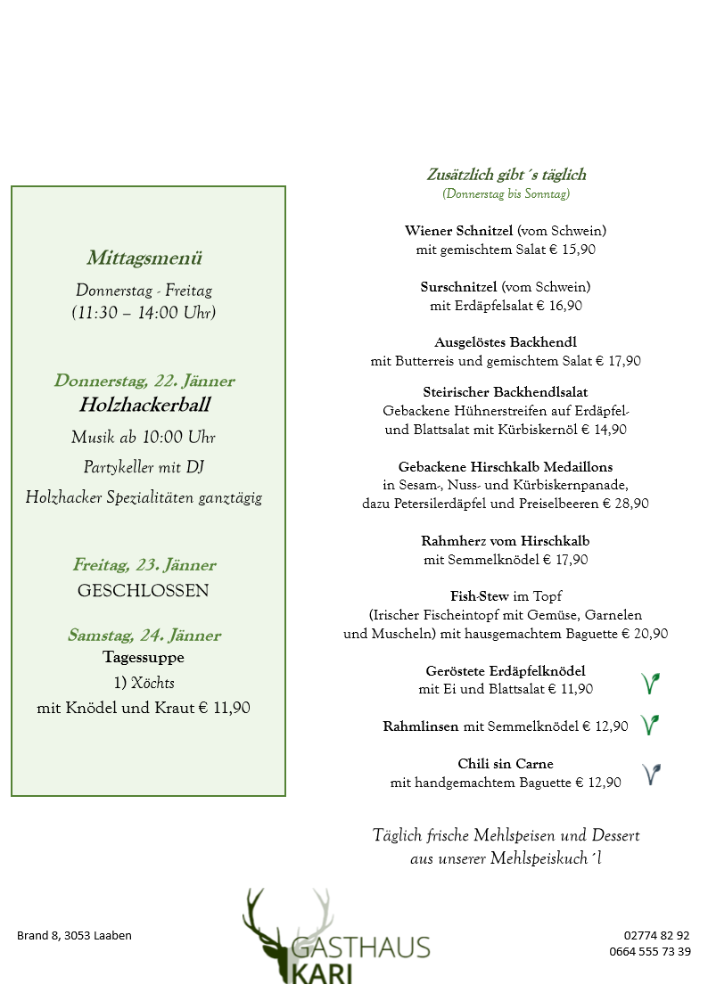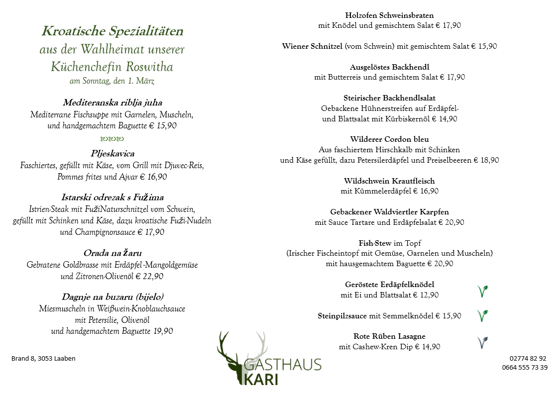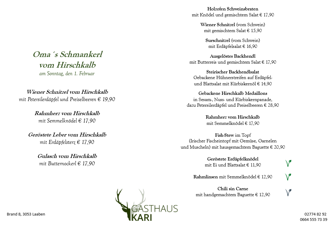 Unser Fleisch beziehen wir ausschließlich von den örtlichen Bauern, dem Fleischhauer Stefan Girsch aus der Nachbarortschaft und aus eigener Jagd.
