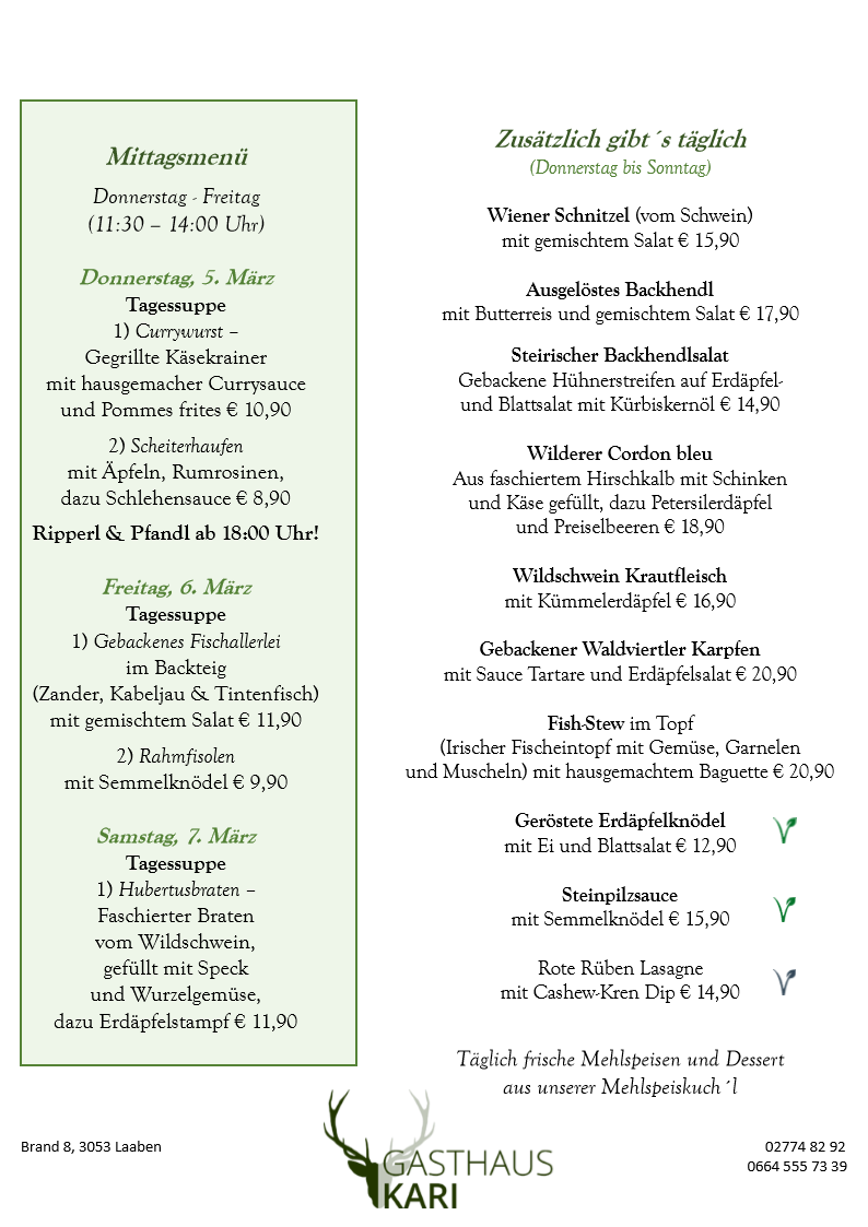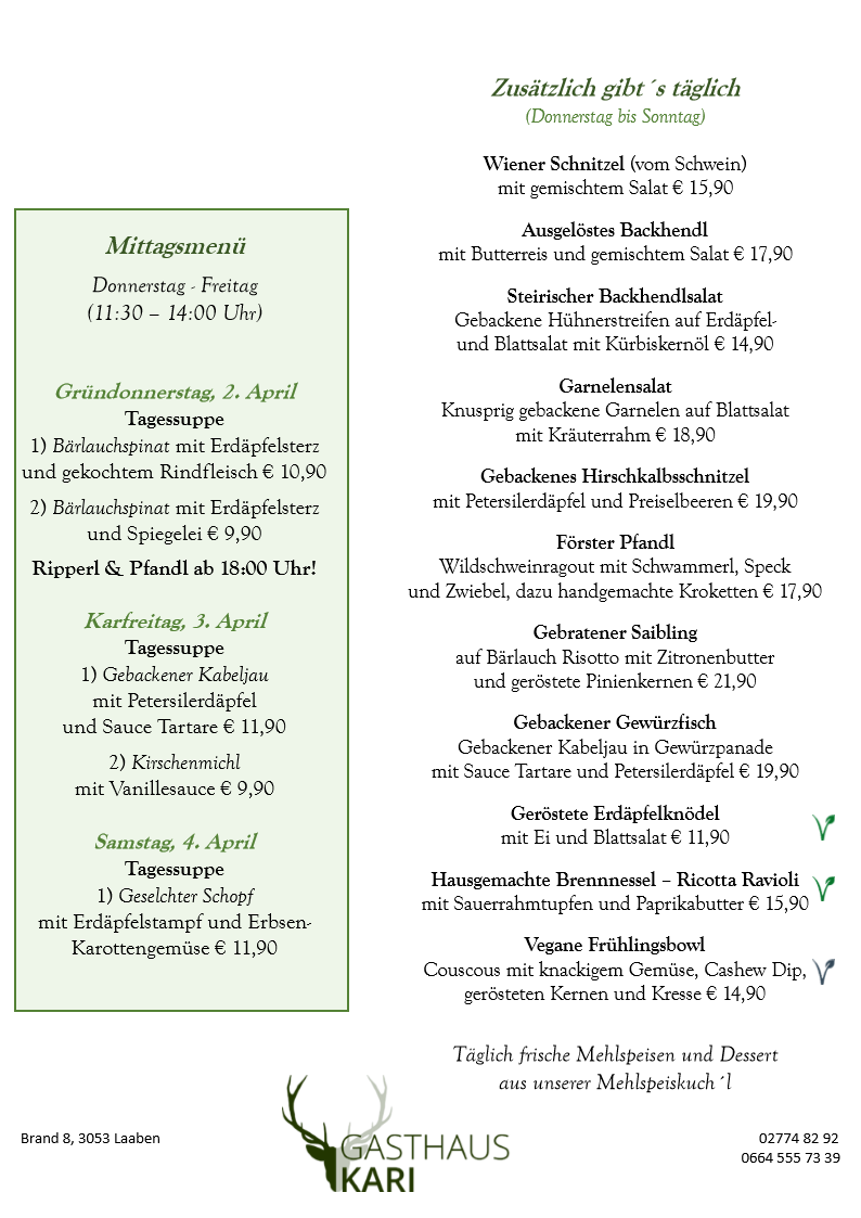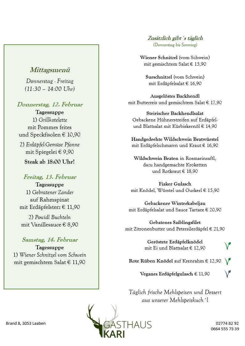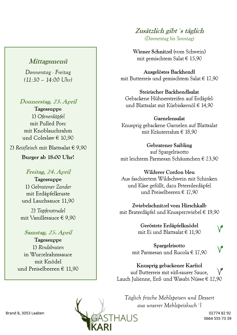 Unser Fleisch beziehen wir ausschließlich von den örtlichen Bauern, dem Fleischhauer Stefan Girsch aus der Nachbarortschaft und aus eigener Jagd.